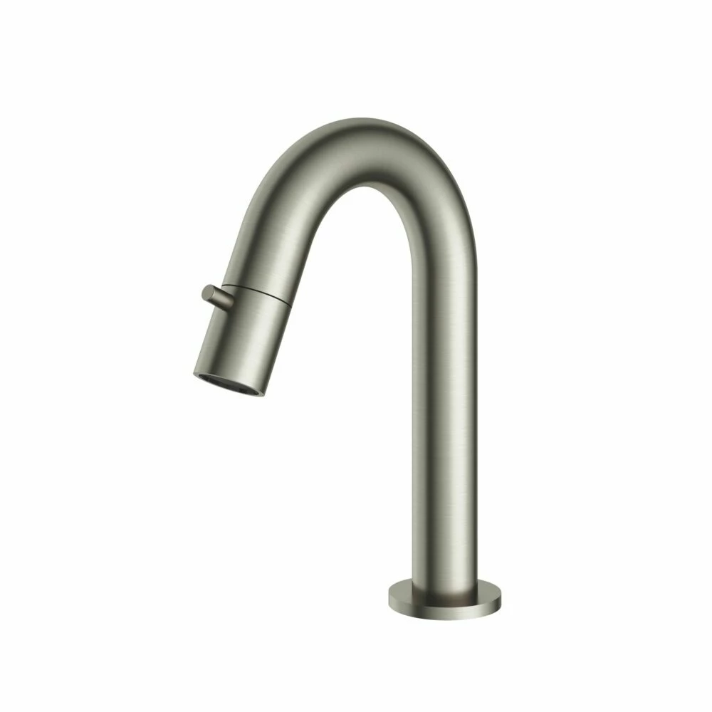 Hotbath Cobber U001 fonteinkraan, uitgevoerd in geborsteld nikkel. Opvallend aan dit model is de vloeiende vorm van de uitloop, dit geeft de fonteinkraan een strakke look. Dit is een fonteinkraan, wat inhoudt dat hij alleen koud water geeft. De fonteinkraan heeft een vaste uitloop en kan worden bediend met draaiknop aan het uiteinde van de uitloop. Combineer de kraan met andere strak vormgegeven items van Hotbath voor een complete look. Typerend voor Hotbath is de Cobber fonteinkraan leverbaar in 15 verschillende kleuren.
